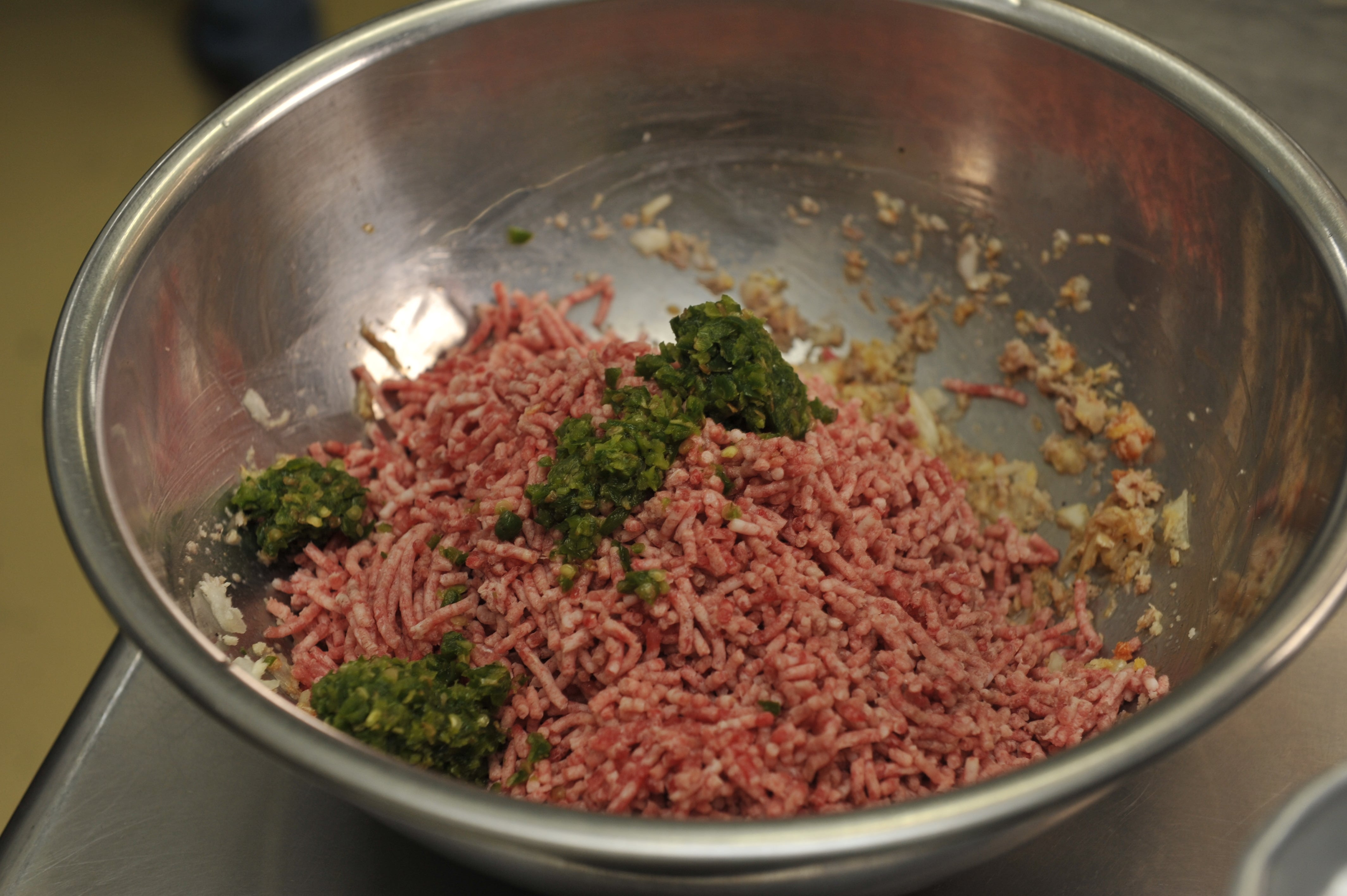 牛・豚合挽肉、たまねぎ、パン粉、ハラペーニョ、牛乳、卵、赤ワイン、ケチャップ、香辛料